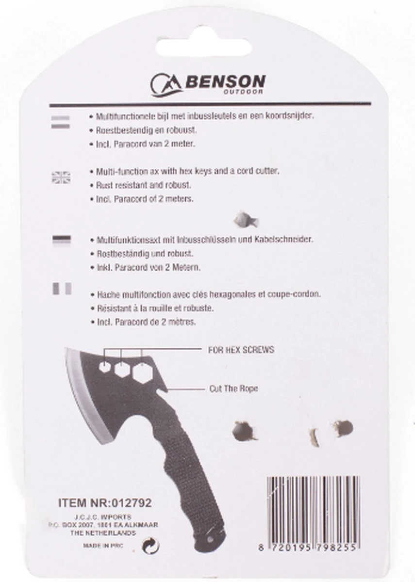 Deze multifunctionele handbijl is roest bestendig, robuust en is voorzien van een koordsnijder. Om het handvat heen zit een paracord van 2 meter.