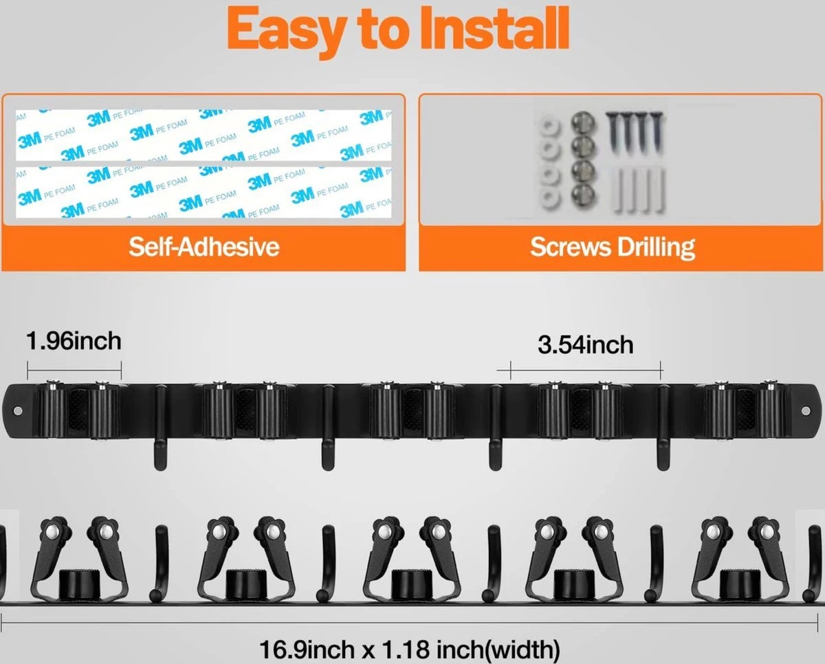 Wat je krijgt : Je krijgt 1 x wandgemonteerde mop- en bezemhouder (5 rack 6 haken), 1 pack tape-sticks en 3 set schroefaccessoires.