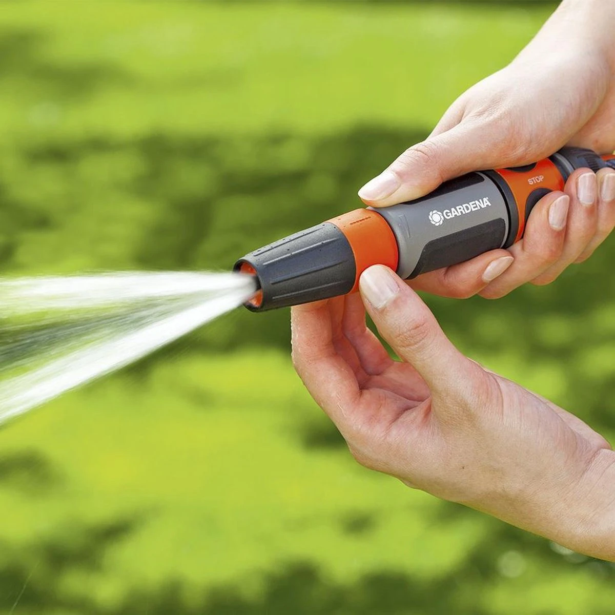 Het besproeien van de tuin of het schoonmaken van een bloempot waren nog nooit zo makkelijk als met de Tuinspuit van Gardena. Je kunt kiezen tussen 2 stralen: een harde straal (om bv. intensief vuil te reinigen) of een fijne sproeinevel (om bv. planten water te geven). Het spuitstuk blijft goed vastzitten op de slang en je zal deze dan ook niet kunnen verliezen.