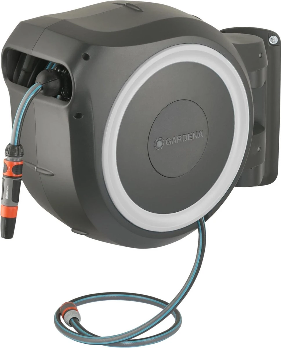 De slangenbox RollUp M voor maximale bewegingsvrijheid bij het bewateren van uw middelgrote tuin Bewatering die altijd gebruiksklaar is: Met de wandslangenbox RollUp M/L is het bewateren van uw tuin een waar genoegen. Deze wandslangenbox bespaart u het moeizame oprollen, uw handen blijven schoon en de slang raakt niet in de knoop. De tuinslang, die aan elke muur kan worden bevestigd, is veilig weggeborgen en zeer ruimtebesparend. Vóór gebruik trekt u de slang van 25 meter uit tot de gewenste lengte. Zodra u stopt, grijpen de extra korte vergrendelingspunten vast en zetten ze de tuinslang vast op de gewenste lengte. Dankzij de handige muurbeugel kan de slangenhouder 180 graden worden gedraaid en uw bewegingen in de tuin ongemerkt volgen. Hierdoor kunt u uw bewateringswerkzaamheden eenvoudig uitvoeren, hebt u maximale bewegingsvrijheid en knikt de slang niet. De slang hoeft niet te worden gebogen of gedraaid als u hem wilt oprollen: lichtjes trekken aan het uiteinde van de slang is voldoende om de vergrendeling los te maken. De hoogwaardige stalen veer in de box rolt de slang automatisch, betrouwbaar en gelijkmatig voor u op. De innovatieve RollControl-technologie zorgt voor veilig en gecontroleerd oprollen. Dankzij de geïntegreerde slanggeleider ontstaan er geen knopen of knikken bij het oprollen van de slang, waardoor schade aan de tuinslang wordt voorkomen. Met de kraan- en slangkoppelingen van het Original Gardena System kunt u de slang flexibel verlengen of andere Gardena opzetstukken bevestigen. Uw Gardena slangopzetstukken zijn altijd klaar voor gebruik. Ze kunnen onder de muurbeugel worden bevestigd en daar worden opgeborgen om ruimte te besparen. Het hoogwaardige materiaal is bestand tegen UV, vorst en andere weersomstandigheden en kan daarom het hele jaar door worden gebruikt. De box is voorzien van diefstalbeveiliging. De slangenbox wordt geleverd met alle vereiste aansluitonderdelen: een muurbeugel, een aansluitslang, alle benodigde Original Gardena System en montageonderdelen en een mondstuk met twee verschillende sproeiopties. Gardena geeft vijf jaar garantie op de hoogwaardige slangopslag.