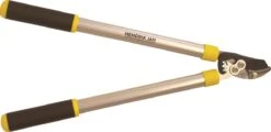 Zeer gebruiksvriendelijke lichtgewicht Hendrik Jan takkenschaar met aambeeld. Een takkenschaar wordt gebruikt voor takken die voor de snoeischaar te dik zijn. Een takkenschaar met aambeeld heeft een snijdend vlak en een stomp vlak. Dat stompe vlak wordt het aambeeld genoemd en dat zorgt ervoor dat de te snoeien tak goed vast ligt en het knippen makkelijker maakt. Een takkenschaar met aambeeld is vooral geschikt voor het snoeien van hard, dood en oud hout. Deze Hendrik Jan takkenschaar heeft een transmissie mechanisme met hefboomwerking, dit zorgt voor minder krachtinspanning bij het snoeien van de takken. Het bovenblad heeft een Teflon anti-kleeflaag waardoor plantensappen en vuil niet aan het blad blijven kleven en overdracht van plant- en boomziektes voorkomen kan worden. Deze Hendrik Jan takkenschaar knipt takken tot een dikte van 35 mm.