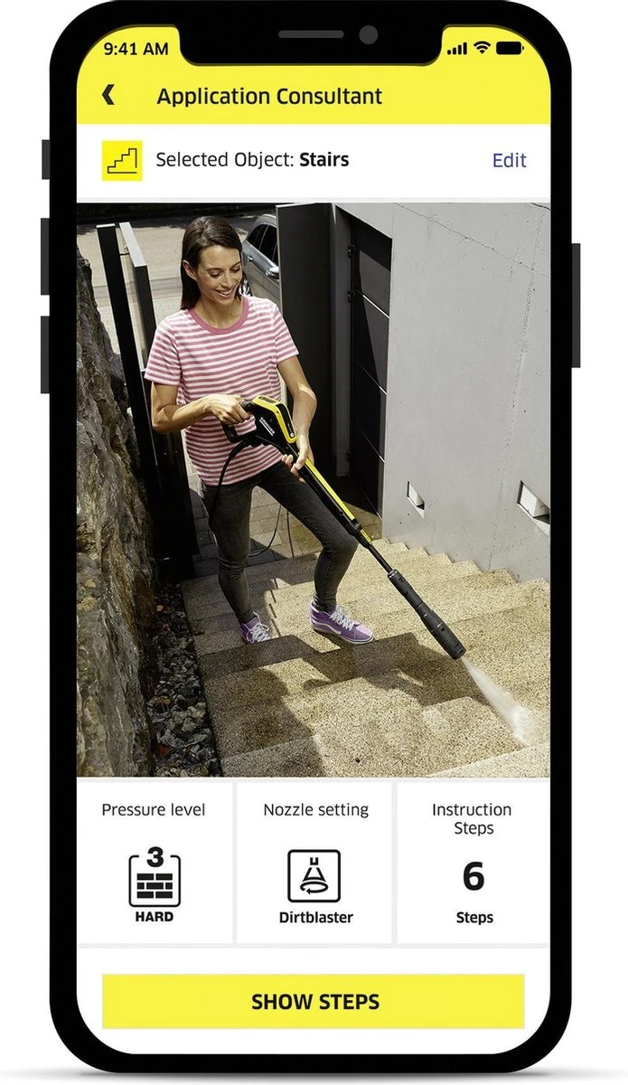 - De app brengt via bluetooth de optimale druk over naar de hogedrukreiniger