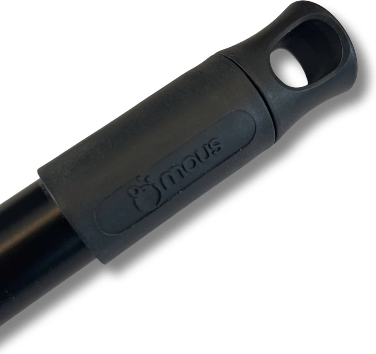 Ook de buik vol van bezems waarvan de steel steeds eruit valt? Dat is vanaf nu verleden tijd. Met deze MAUS set schroeft u de steel in de houder. Daarna draait u als extra vergrendeling de groene koppeling aan. Een gegarandeerd stevige verbinding. Ook de steel zelf is op stevigheid ontworpen van a-kwaliteit staal. Een steeldiameter van 24 milimeter maakt deze steel extreem robuust. De zwarte coating geeft de levensduur nog een extra boost. Door middel van het ophangoog hangt u het gereedschap na gebruik handig op.