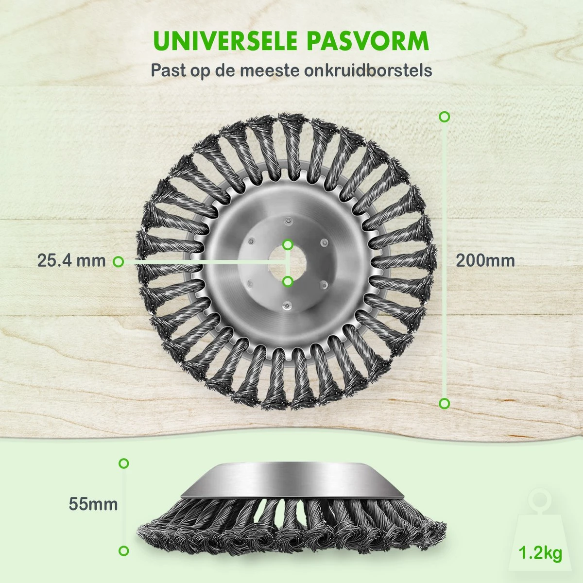 Deze onkruidborstel is sterker dan de traditionele onkruidborstels. De borstels bestaan uit gedraaid staaldraad. Elke gedraaide staaldraad heeft hetzelfde aantal staaldraden en is gelijkmatig verdeeld om een goede werking te garanderen en vermoeidheid van de motor te voorkomen. De onkruidborstel heeft een maximaal toegestaan toerental van 10.000 toeren per minuut.