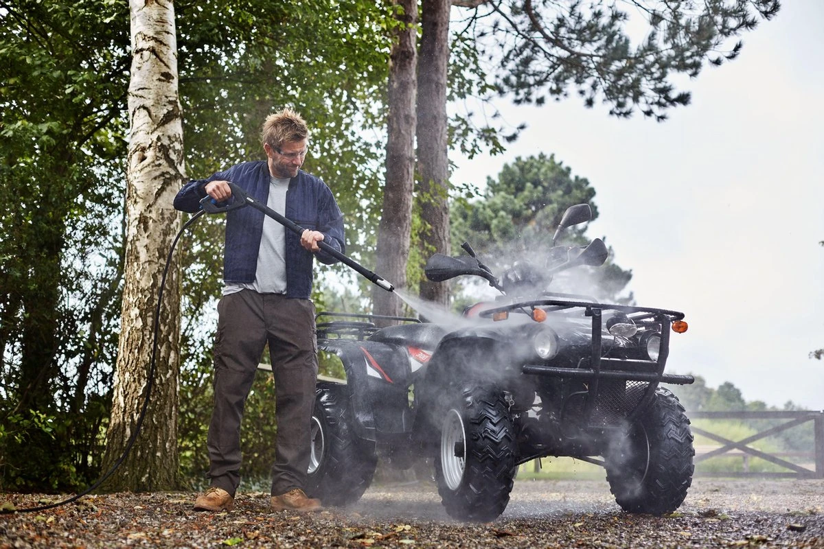 Aluminium cilinderkop | Telescopische duwbeugel | Eenvoudig te verplaatsen door de grote wielen | Drukregeling op de machine | Haken voor het opbergen van de elektrische kabel | Geïntegreerde reinigingstank met reinigingsmiddeldosering en extra lange slang voor reinigingsmiddelaanzuiging | De lange lans zorgt voor een goede werkhouding